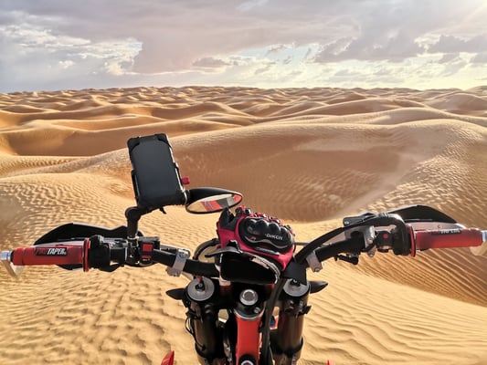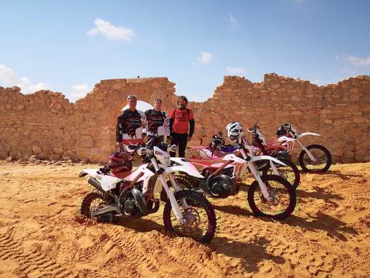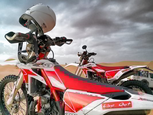 Qualsiasi pneumatico enduro racing è adatto ad un viaggio nel Deserto, il mio consiglio è di usare dei Mid/Hard per avere più resistenza all’usura nei tratti rocciosi. Nel caso si pensi di fare diverse esperienze consecutive nel Deserto, è il caso di prendere in considerazione delle gomme specifiche da rally molto più resistenti, noi utilizziamo l'accoppiata MITAS E12 Rally Star al posteriore e all'anteriore il MITAS C21 Stoneking, sono pneumatici molto resistenti e performanti. Sconsiglio gli pneumatici a pale esclusivamente da sabbia (ricordiamoci che il deserto è anche fatto di distese piatte, piste rocciose ...) Camere o Mousse: per le camere sicuramente bisogna andare sulle rinforzate, utilizziamo da anni le 4 mm. Le mousse si possono utilizzare a patto che siano nuove o recenti. Non è piacevole ritrovarsi nella sabbia con mousse che non tengono più il tallone del pneumatico sul cerchio. Trasmissione: la catena va completamente delubrificata, obbligatorio l'utilizzo di catene con O-ring (meglio ancora se X-ring), in caso si pensi di fare un utilizzo intensivo nel Deserto, esistono delle catene da rally molto più resistenti. Meglio arrivare all’evento con una trasmissione nuova o recente. La corona è da preferire con i denti in acciaio per la maggiore resistenza all’usura, soprattutto se la cilindrata della moto è elevata. Per i rapporti, si possono tranquillamente lasciare quelli da Enduro classico, sconsiglio di allungare troppo a meno che si prevedano lunghi trasferimenti o una prevalenza di piste veloci e scorrevoli.
